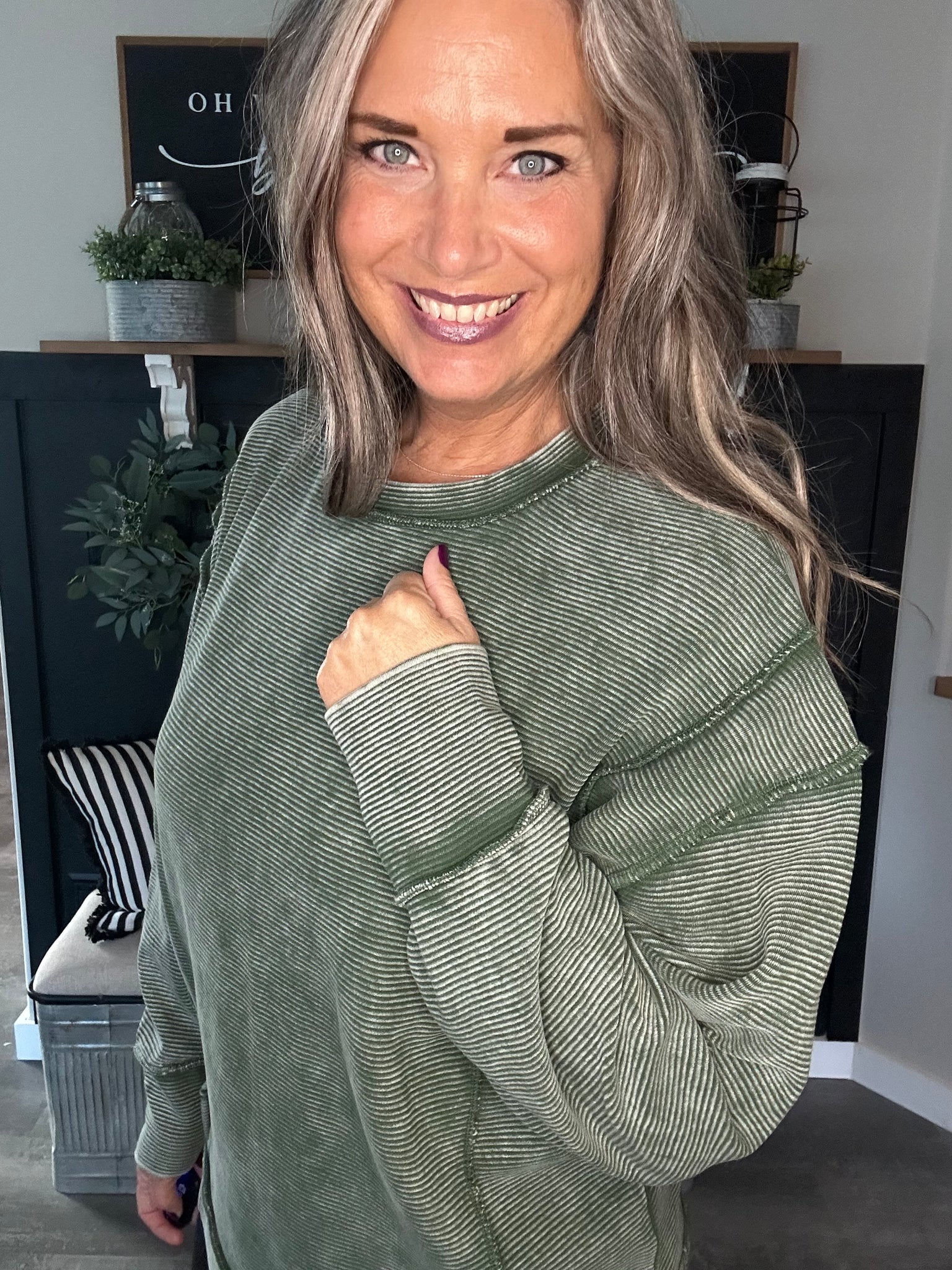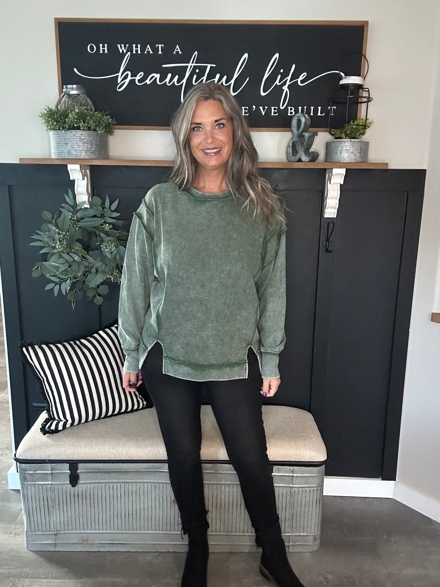 Upgrade your wardrobe with this Acid Washed Ribbed Crew. The double ribbed exposed seam adds a stylish touch to this dark green pullover. Keep your look casual and cool with this must-have piece. Perfect for any occasion, this crew neck will keep you comfortable and trendsetting.