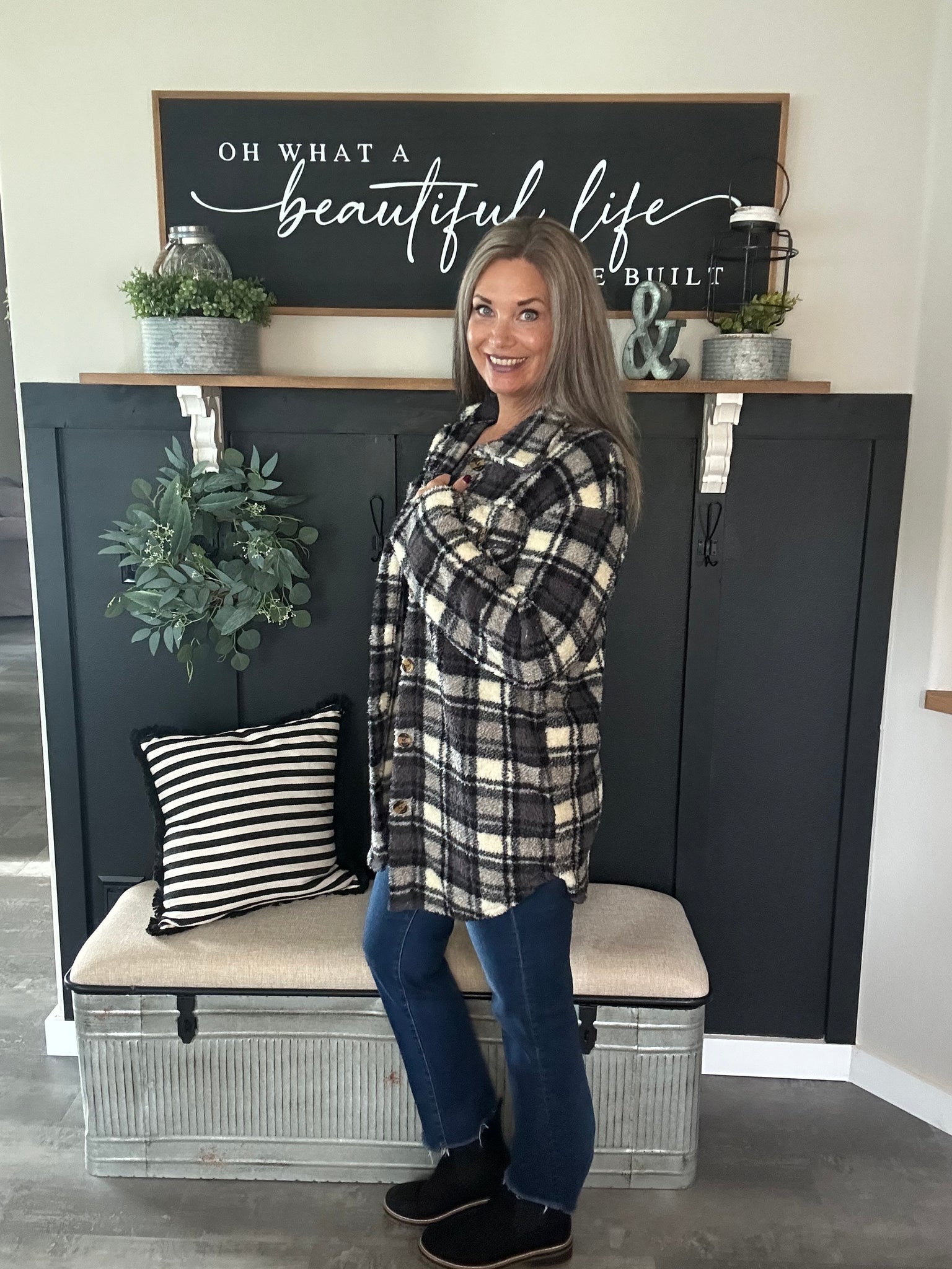 Pair the Black & Gray Fleece Sherpa Shacket with jeans, leggings, or joggers for an effortlessly cool, laid-back look. Whether you’re heading out for errands, coffee runs, or weekend outings, this shacket is your go-to outerwear piece.