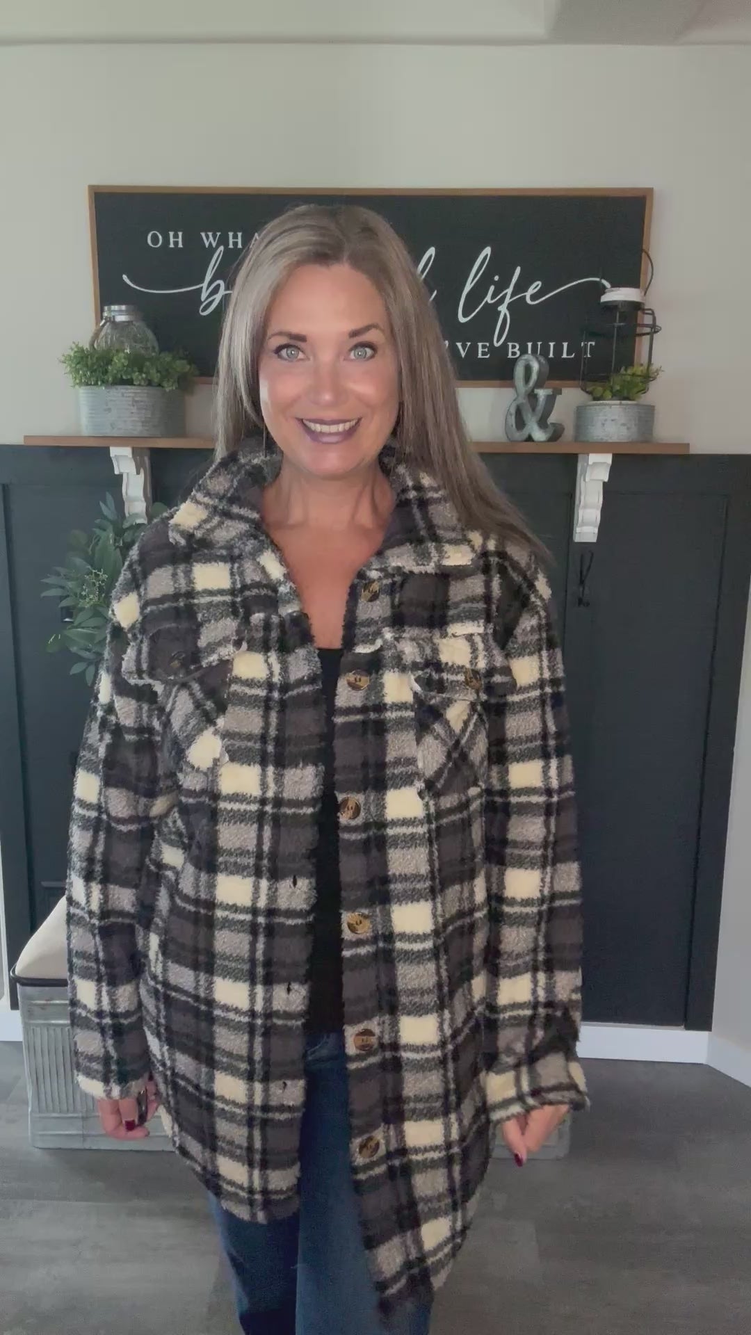Layer up in style with the Black & Gray Fleece Sherpa Shacket. A cozy oversized shirt jacket with soft sherpa fleece, side pockets, and button-down design.