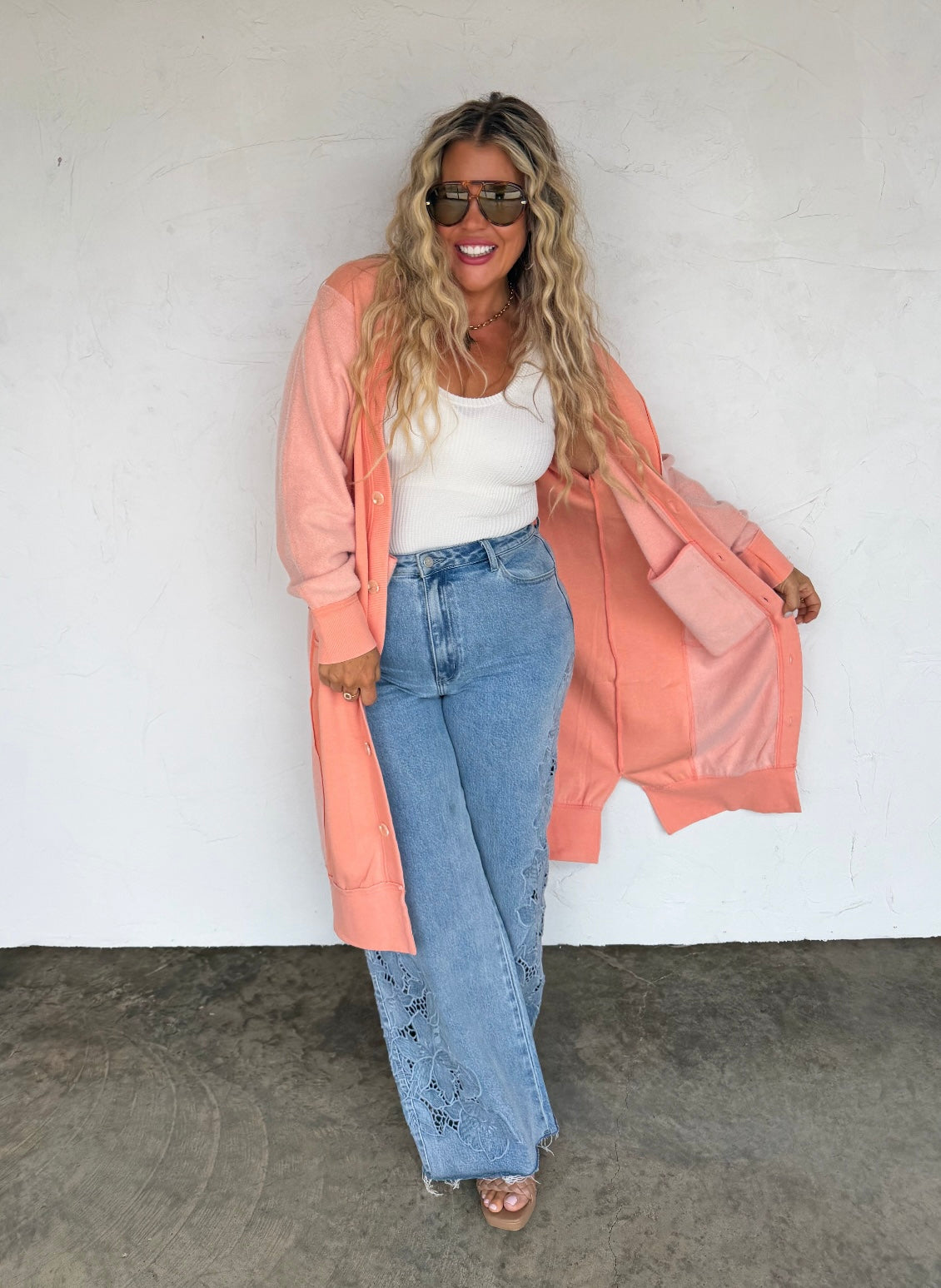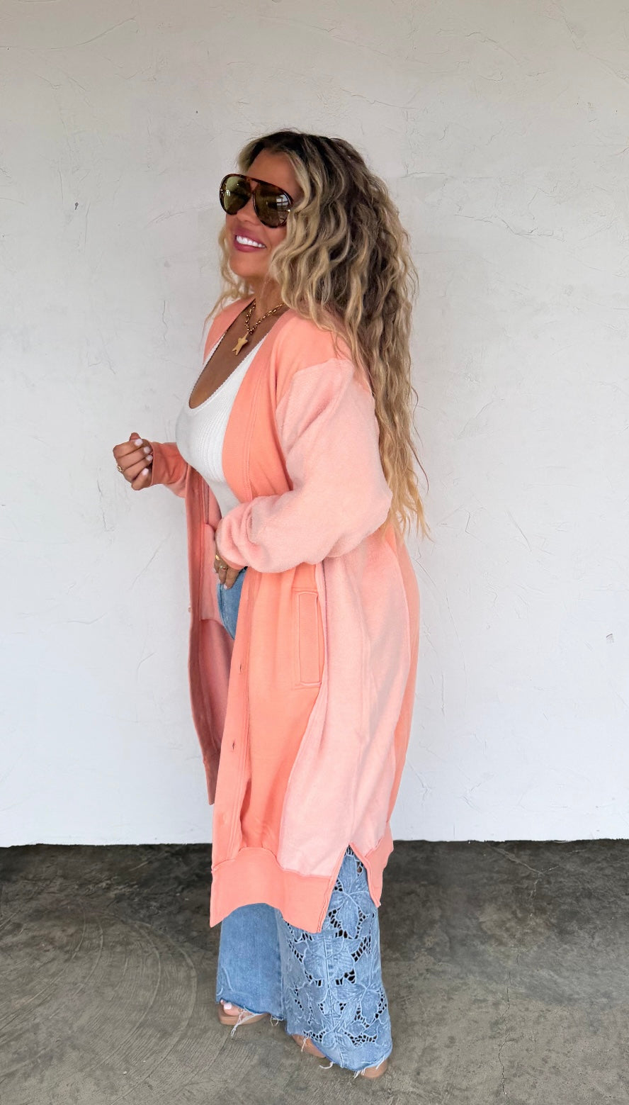 Elevate your spring wardrobe with the Blakely Spring Desi Sweatshirt Cardigan. This versatile piece features a soft, lightweight knit in a beautiful coral-peach hue that adds a pop of color to any outfit.