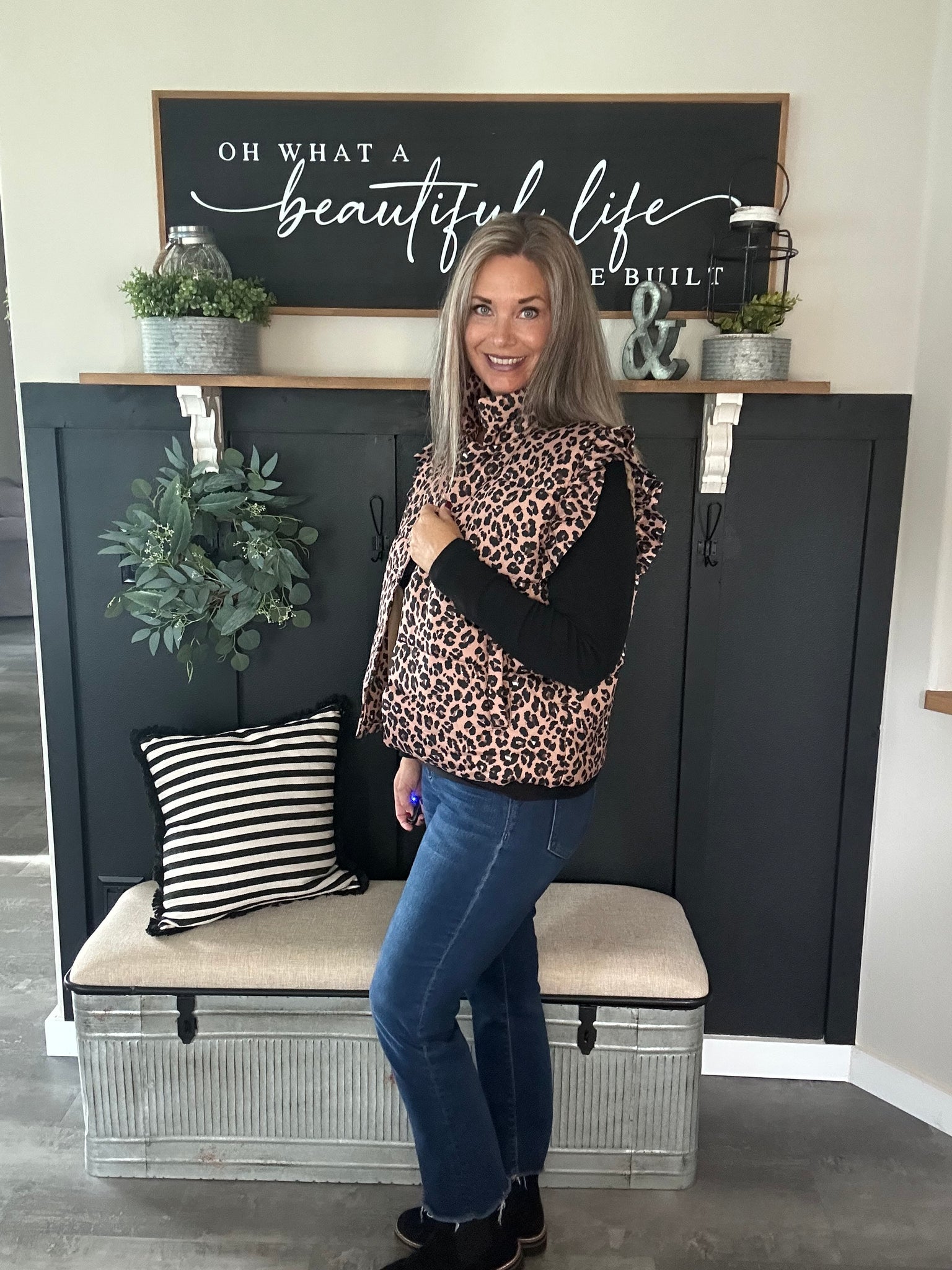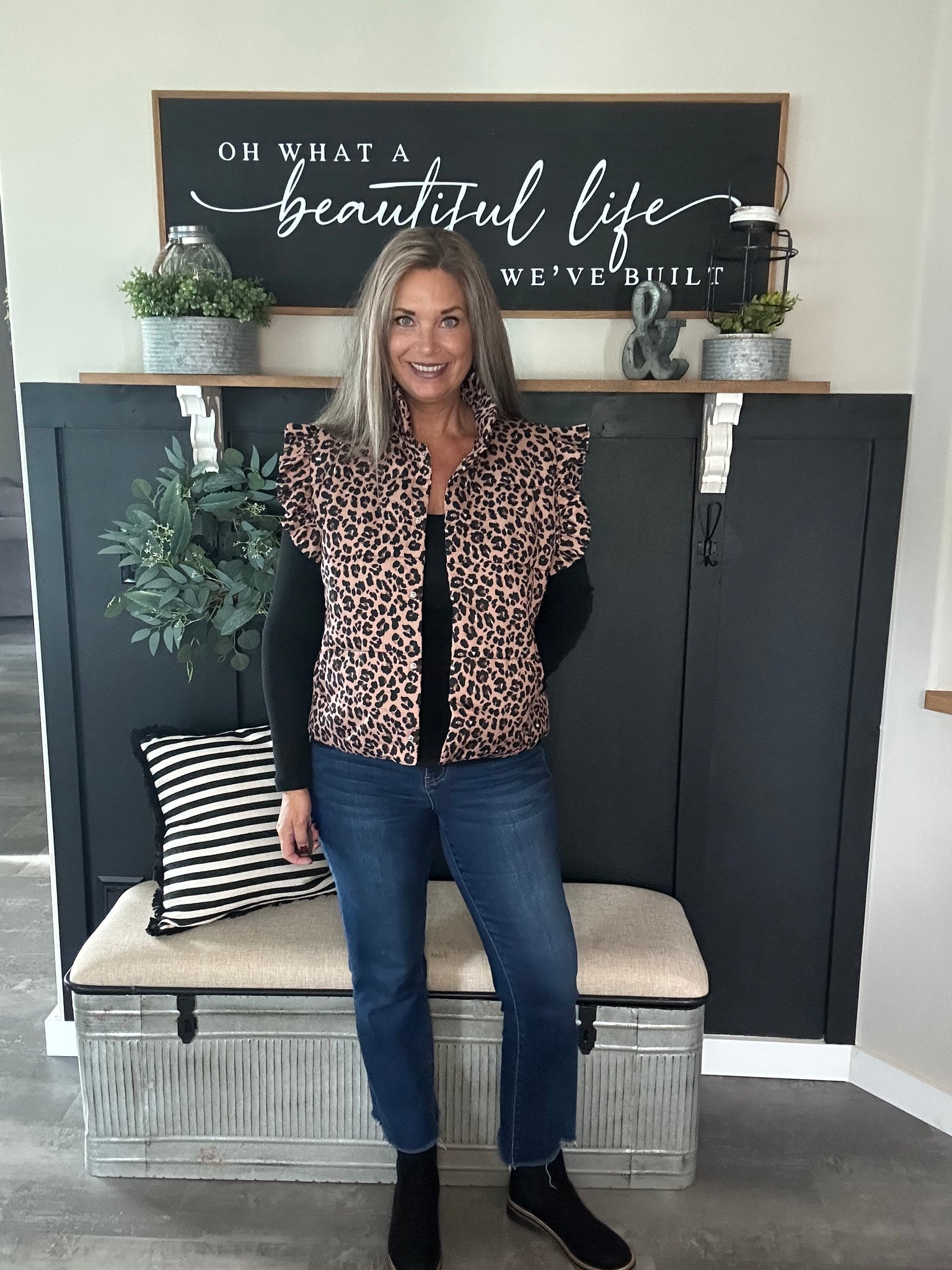 Stay warm and chic this season with the Clara Leopard Puffer Vest. Designed with ruffle sleeves and a trendy leopard print, this vest adds a pop of personality to any outfit. Its cozy design provides both style and warmth, making it a must-have for your wardrobe.