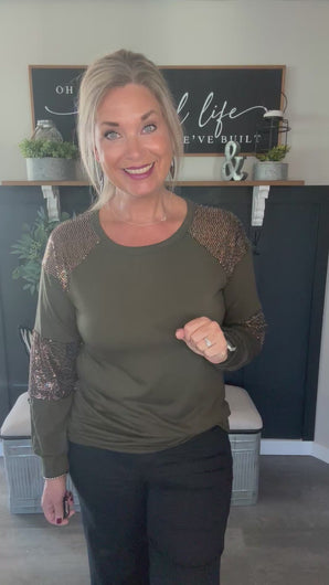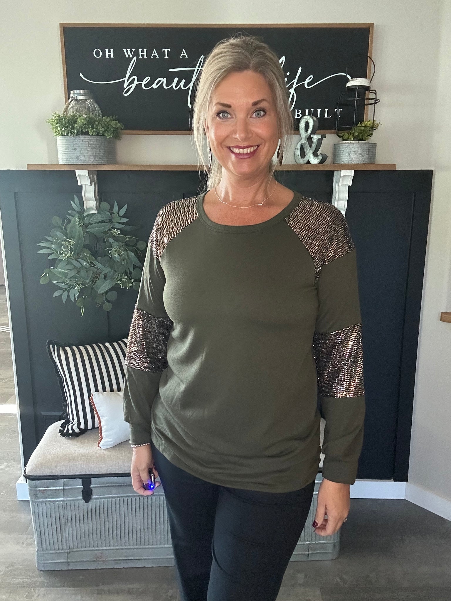 This Army green holiday top will add the perfect touch of sparkle to your outfit, making you stand out at all your holiday events. With its comfortable fit and eye-catching sleeves, it's the perfect top for any festive occasion.