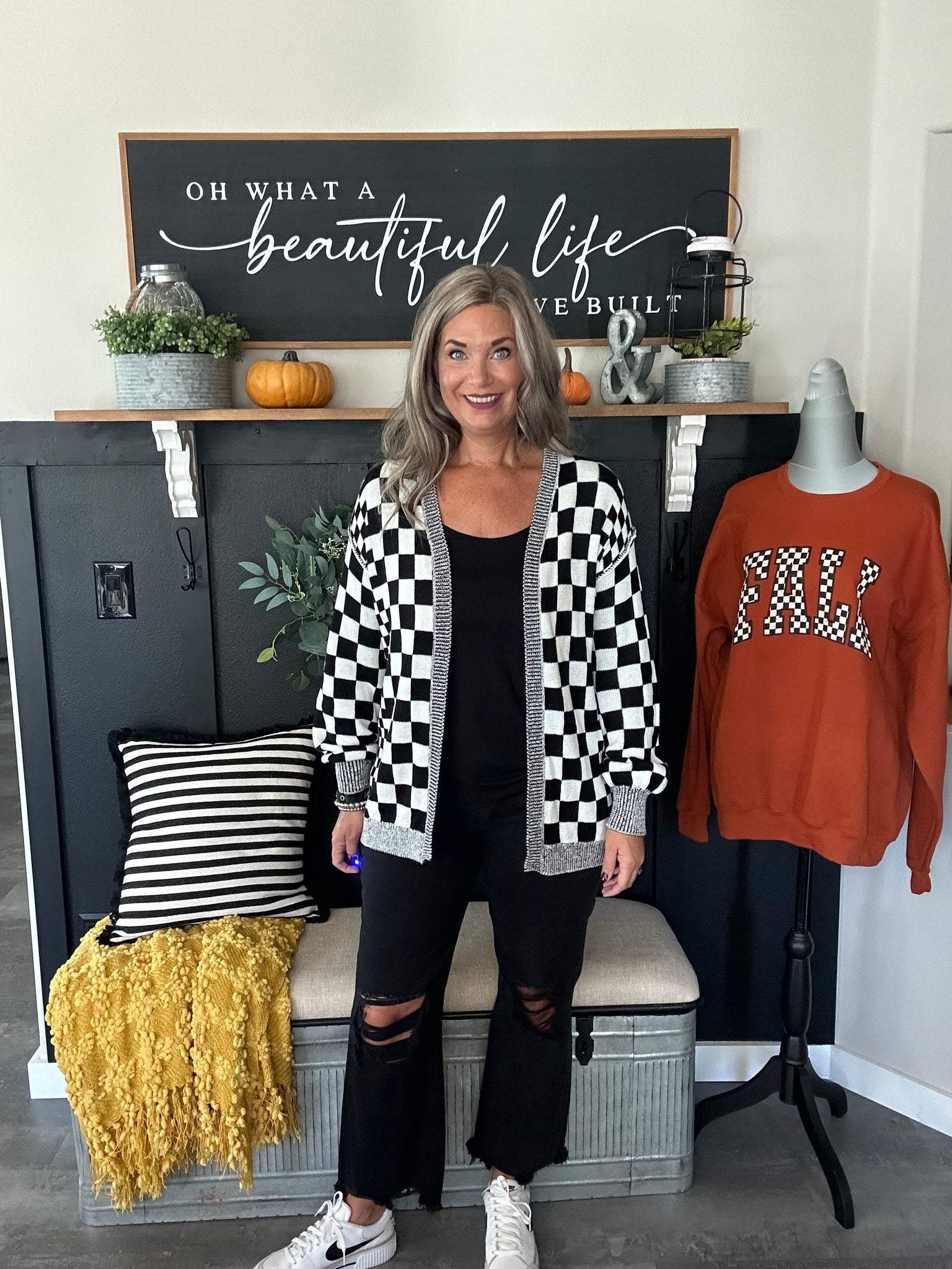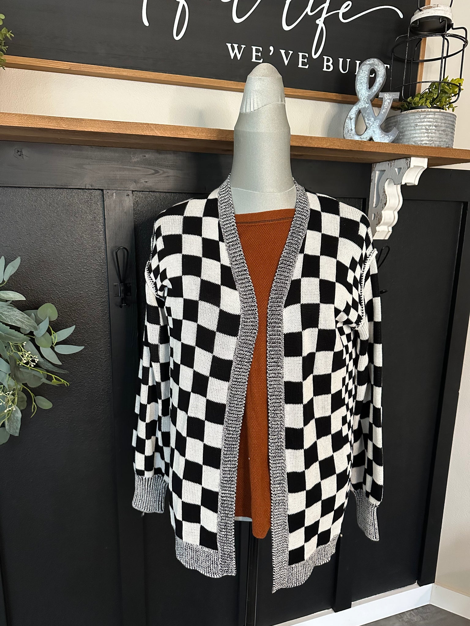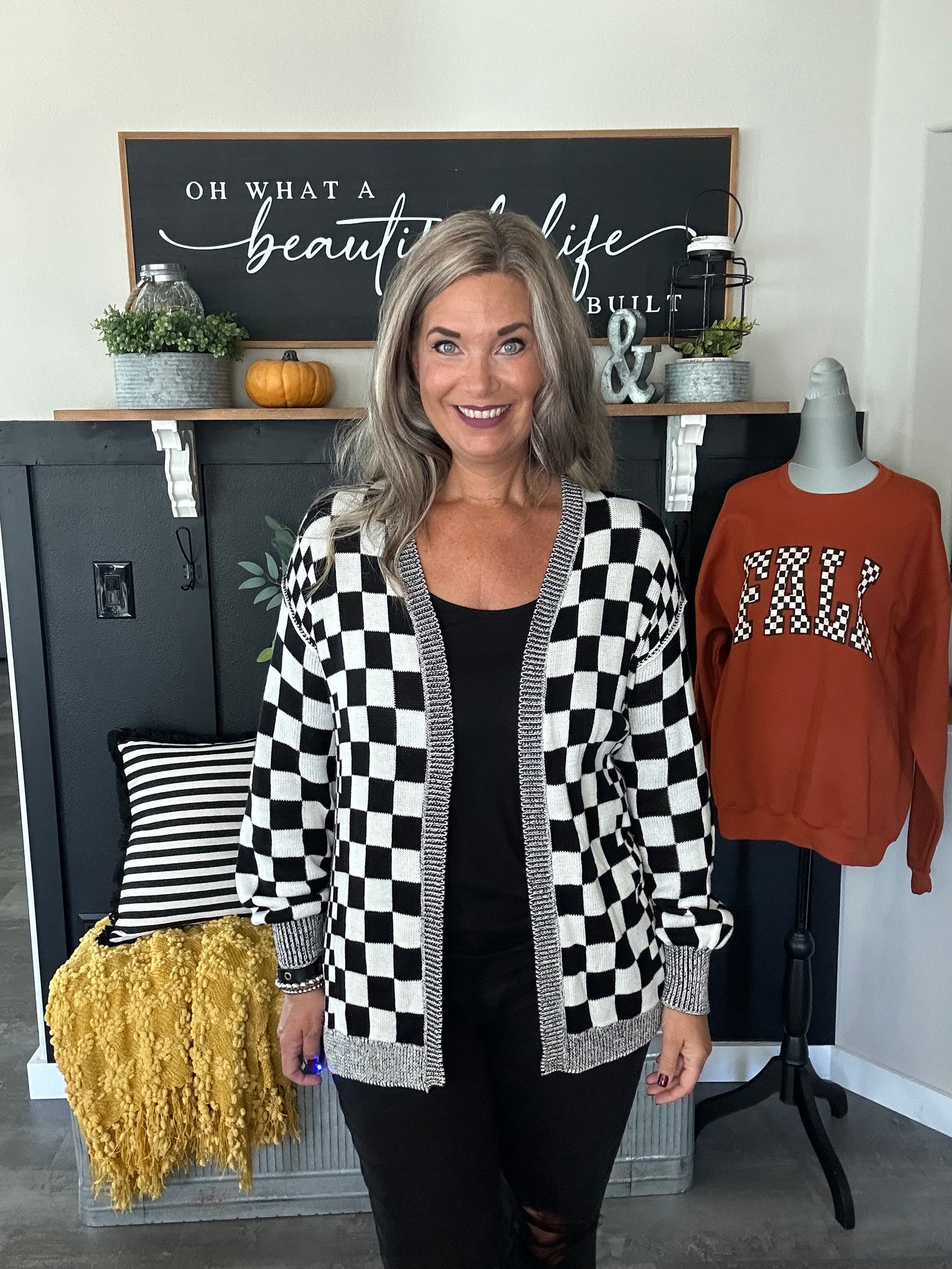 Make a bold statement with this black and white checkered cardigan, the perfect layering piece for every season. Featuring a trendy checkerboard design, this open-front sweater combines comfort with streetwear style. The soft knit fabric keeps you cozy without being too heavy, while the ribbed cuffs and hem add a polished finish.