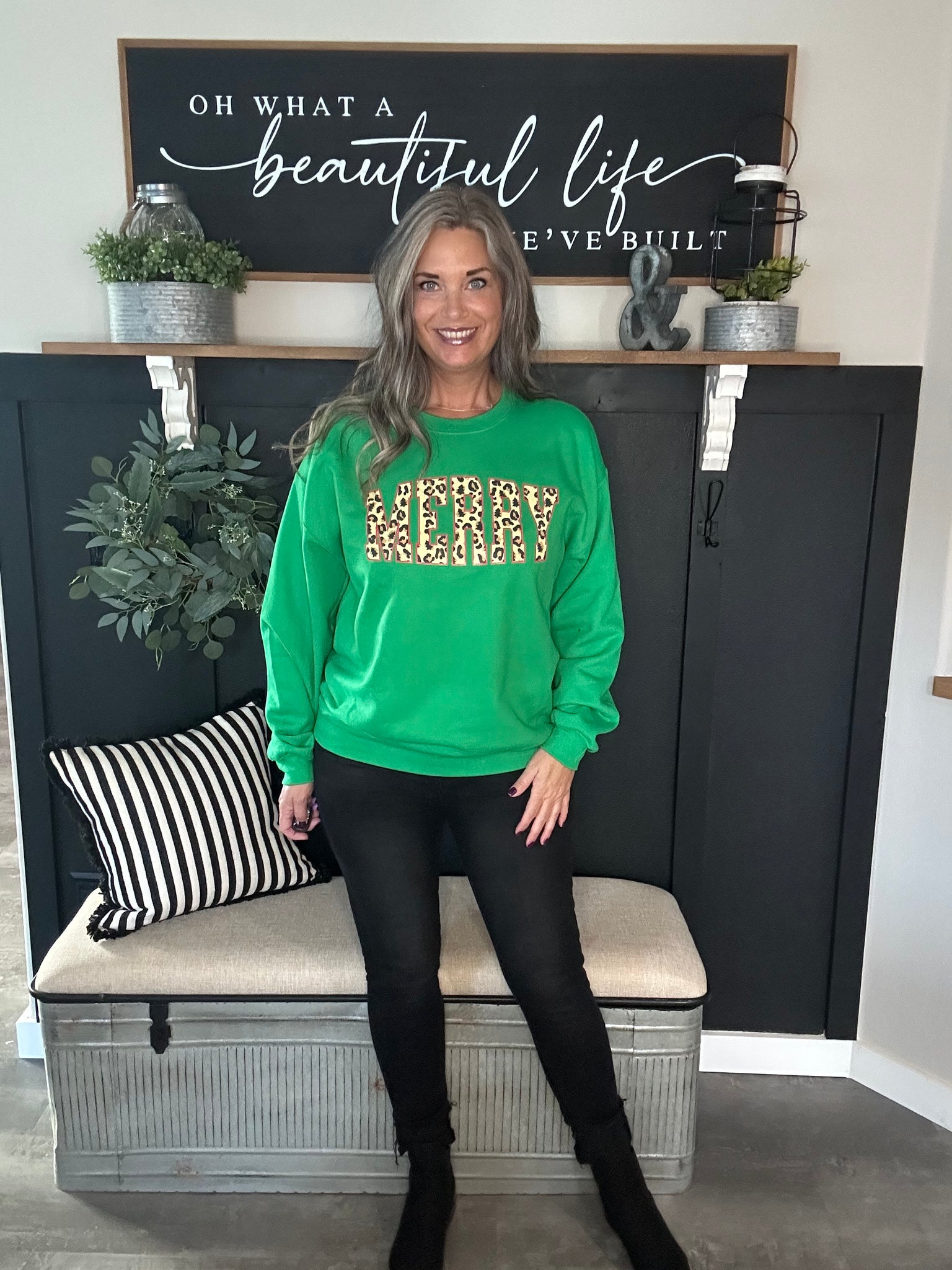 Stay cozy and stylish with the Leopard Merry Crewneck in Kelly Green. This comfortable crewneck features a playful leopard print that adds a fun, trendy touch to your casual wardrobe. Perfect for layering or wearing on its own, it offers warmth and a cheerful pop of color to brighten your day.