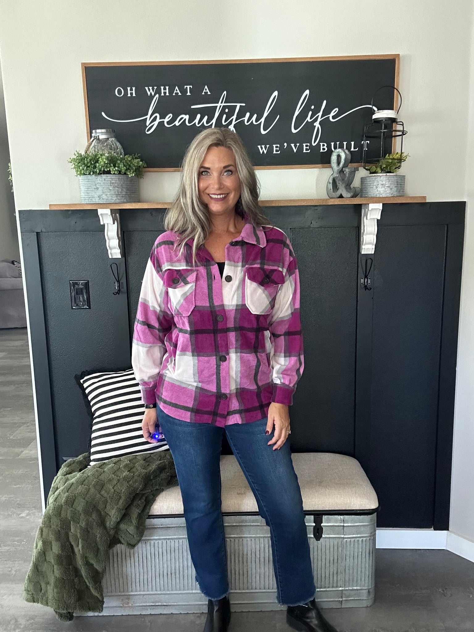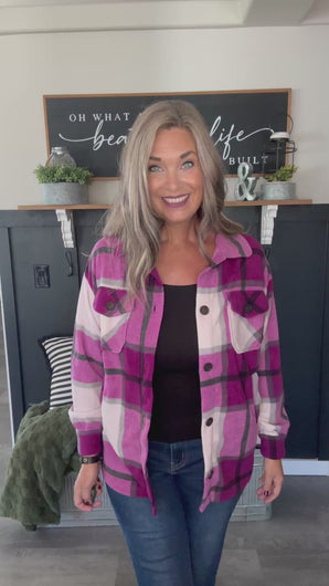 Stay warm and stylish in our Plum Plaid Fleece Shacket. This shacket offers a cozy fleece interior and a trendy plum plaid design. Perfect for chilly days, it combines the comfort of a shirt with the warmth of a jacket. Button it up for a chic look or wear it open for a more casual vibe.