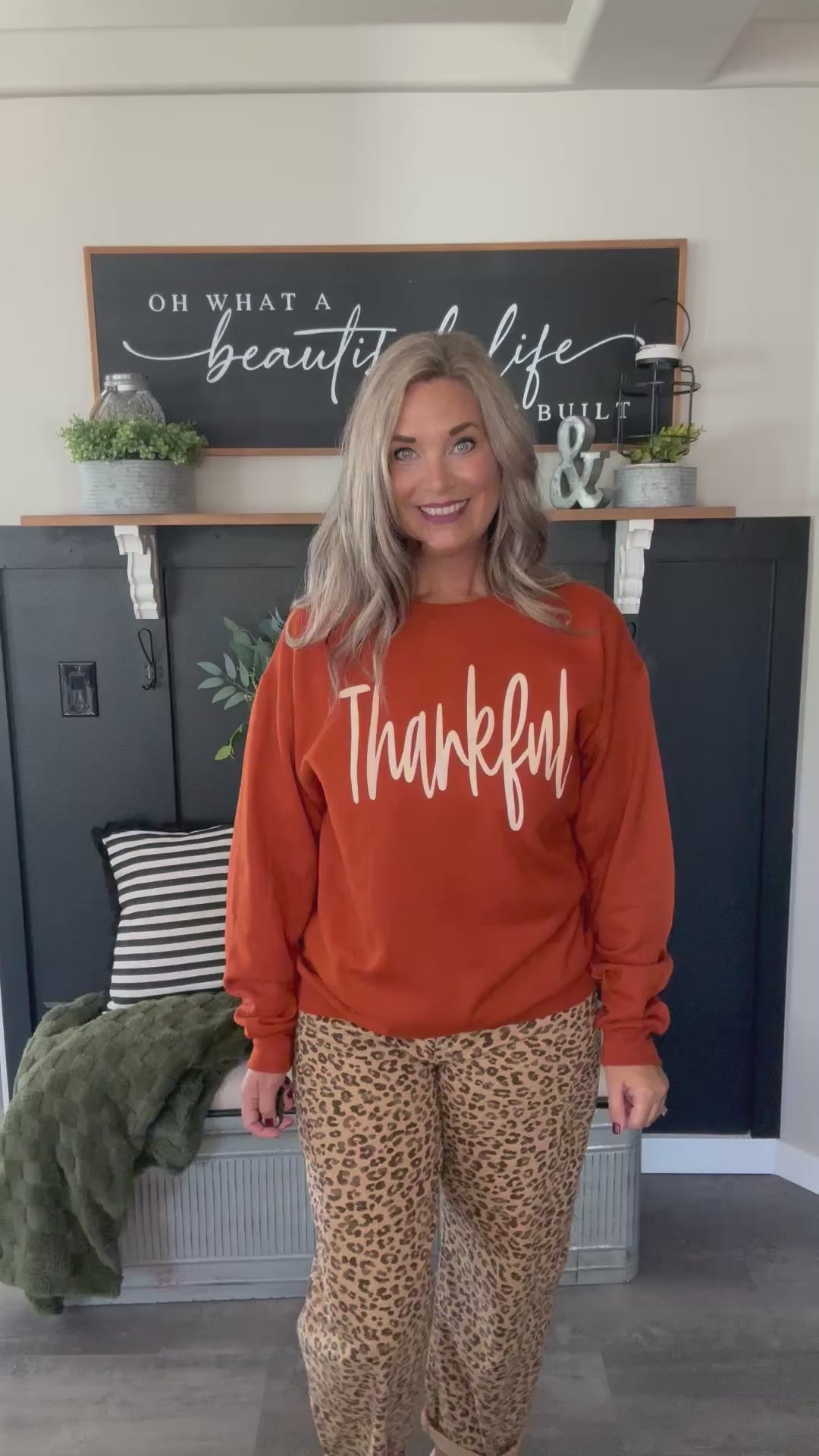 Elevate your autumn wardrobe with this Thankful Fall Graphic Sweatshirt in a rich burnt orange hue. Crafted for comfort and style, its warm color perfectly complements the season’s palette, making it an ideal choice for cozy gatherings or casual outings. The sophisticated design blends subtle seasonal charm with everyday wearability, ensuring you stay both comfortable and chic throughout the fall.
